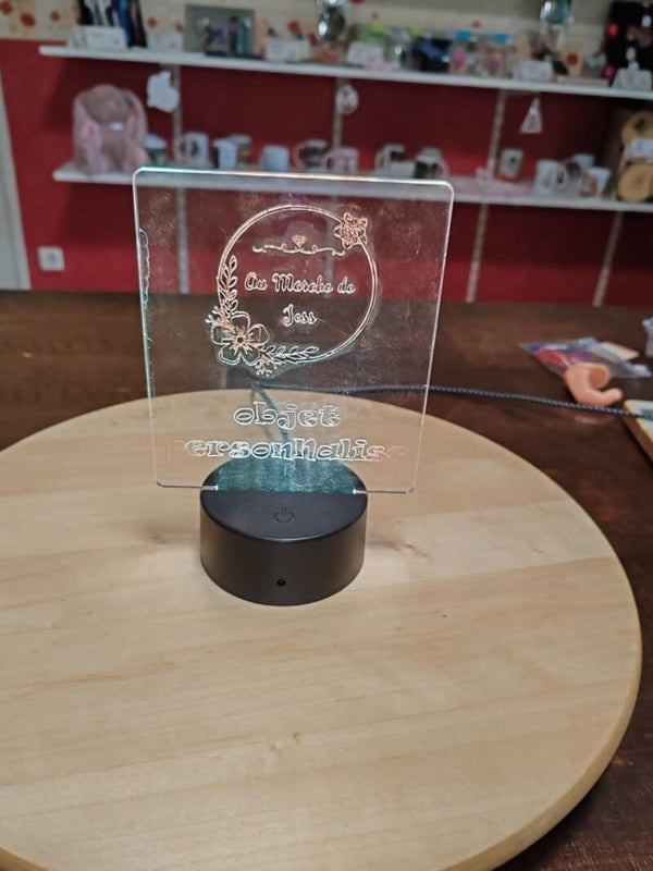 Plexiglass gravé personnalisable. Nous pouvons mettre image ou un texte gravé, avec support lumineux à LED. Qui a plusieur couleur, dont plusieurs mode. Cable USB fournies avec, et possiblitée de mettre 3 piles AA et télécommande fournie.