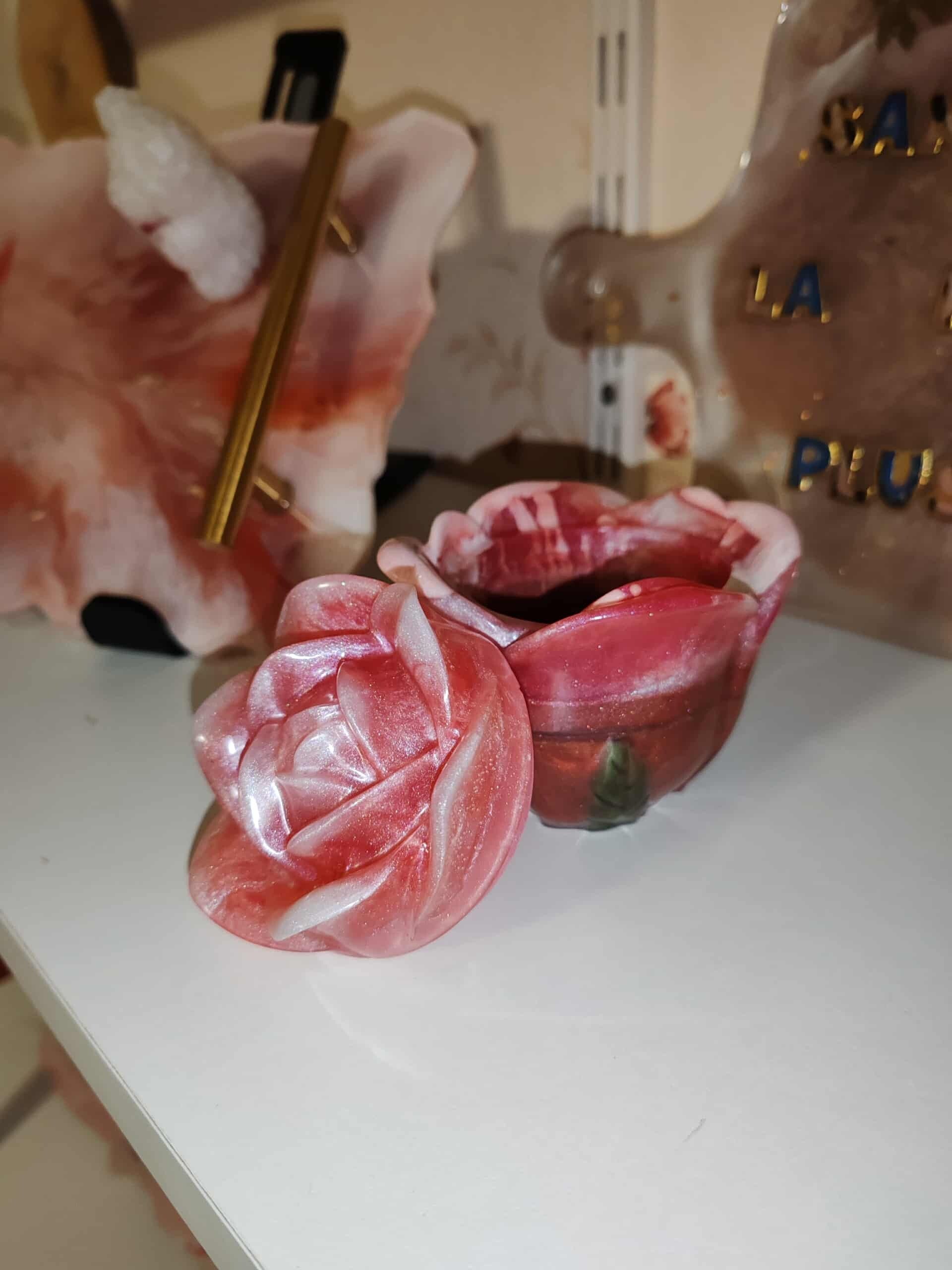 Boite en forme de rose entièrement fait en résine. Qui peux être personnalisé en choisissant les couleurs, ont y mettre aussi un prénom.